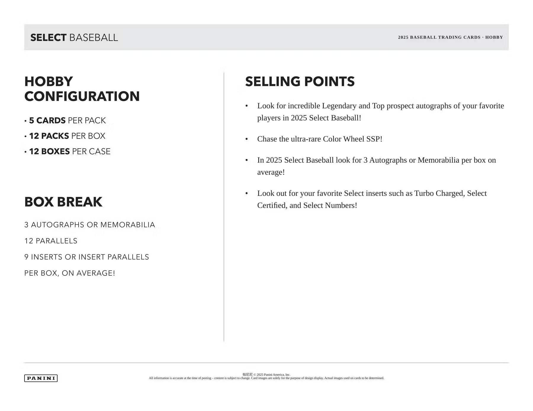 La 2025 Panini Select Baseball Hobby Box es una de las cajas más apreciadas por coleccionistas de béisbol que buscan alto potencial de hits, rookies destacados y paralelos con tirajes bajos.